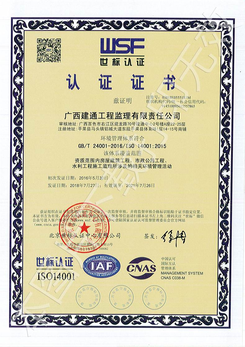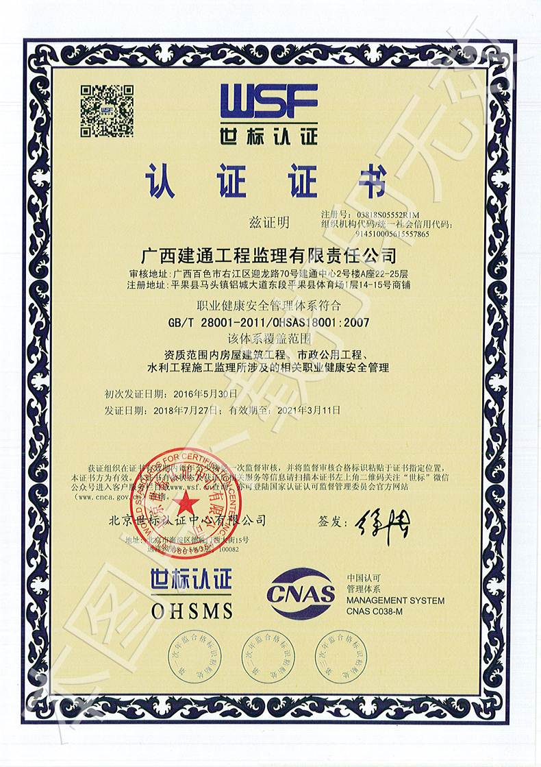 廣西建通工程監(jiān)理有限責(zé)任公司三大管理體系認(rèn)證證書(shū)
